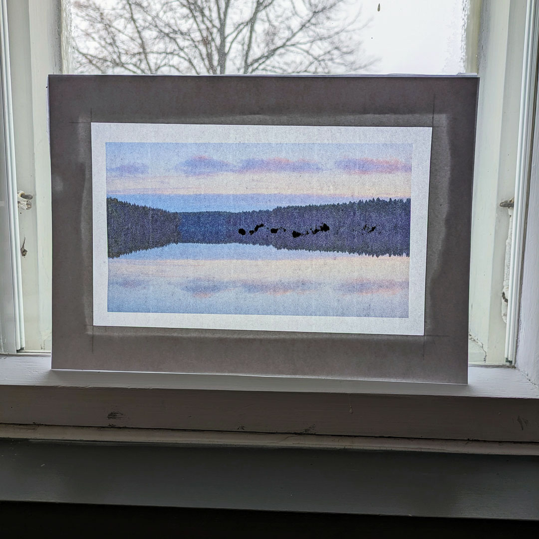 Marraskuun kuvan tulostin isompana. Se ei aivan onnistunut noista mustista kohdista. Pitäisi ottaa useampia vedoksia ja testailla, mutta tämä on aikamoista askartelua. En tiedä vielä mihin tätä käyttäisin, mutta mielenkiintoinen menetelmä pohdittavaksi. Monesti paperissa on kaksi puolta, niin kuin tässäkin. Toinen on kiiltävämpi ja sileämpi ja toisessa on enempi tekstuuria. Niitä pitäisi kokeilla, samoin paperiasetuksia matte vai glossy sekä tulostuslaatua normal vai fine jne… Tulostettavaksi valitulle kuvalle valitaan sitten näistä sopiva kombinaatio.