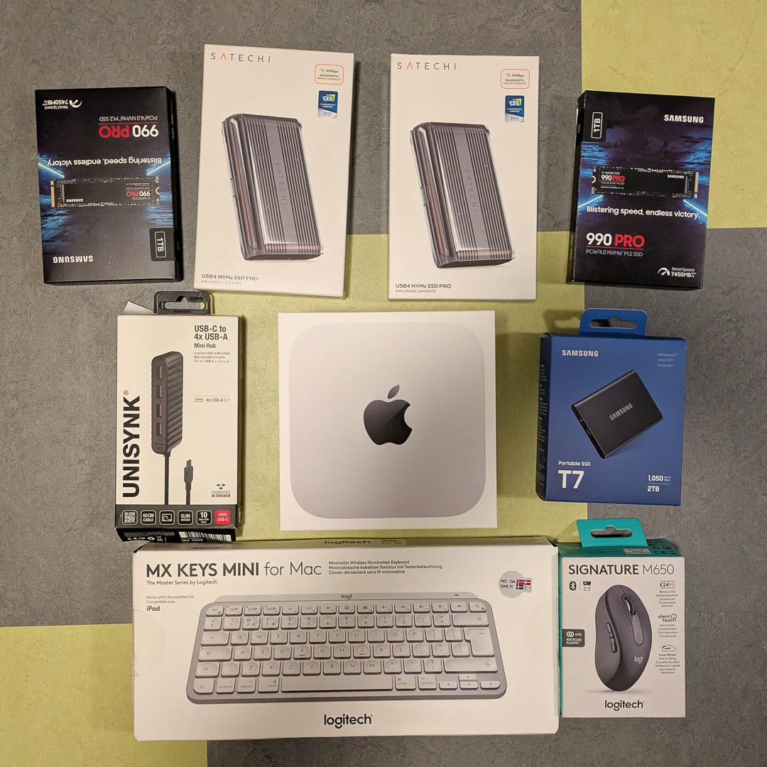 Voidaan todeta, että toimii. Rehellisesti sanoen, eihän tuo pieni ja sievä mini ole enää kovin sievä kun siitä roikkuu kolme ulkoista asemaa ja yksi USB-hubi, josta roikkuu kortinlukija. Siistiytyy vähän jos USB-A:t saisi näytöstä. Olisihan se siistimpi jos kaikki olisi samojen peltikuorien sisällä, en kiistä.