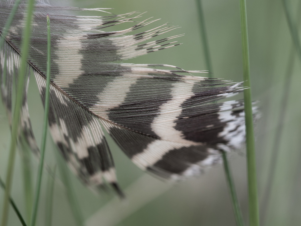 Aikaisemmin keväällä (13.5.) löysin pyrstötiaisparin rakentamassa pesää. Nyt pesä oli tyhjä ja osa rakennusaineista jo levinnyt ympäristöön. Esimerkiksi tällaisia höyheniä. Otetaan siis höyhenkuva. Toisessa kuvassa käytettiin höyhentä soft focus filtterinä metsätähteä kuvatessa. Aika lälly eiku hieno.